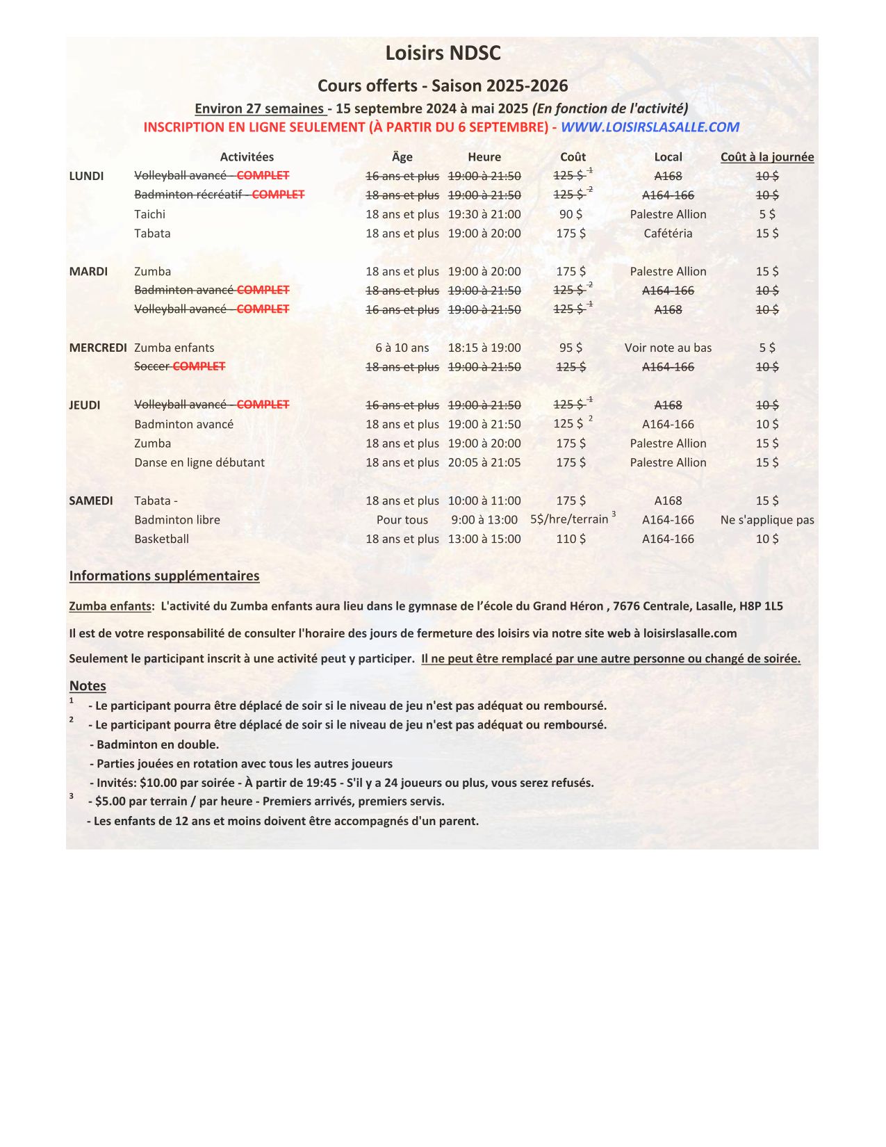 Loisirs NDSC permet aux gens de tous âges de se divertir, de découvrir de nouvelles activités et de développer leurs talents multiples. Loisirs NDSC offre une grande diversité d’activités et de cours à la population principalement laSalloise sur une période s’étalant de la fin de septembre à la fin d’avril à des prix très abordables.